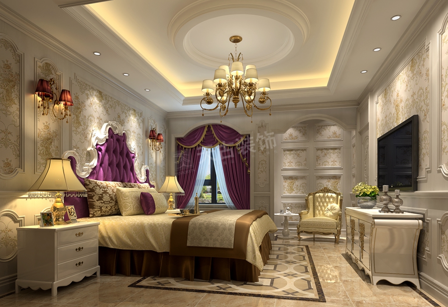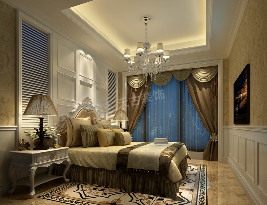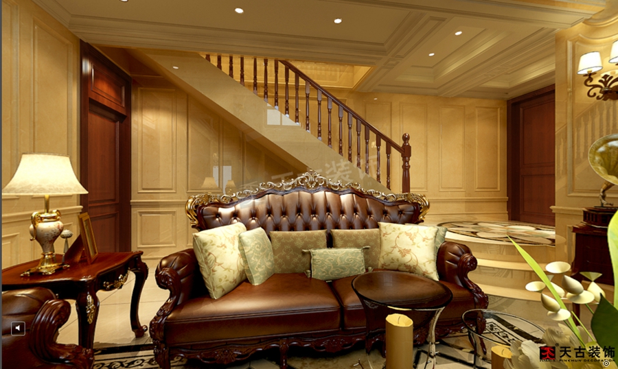 本案在设计手法上,以欧式传统风格为主调,既不过分张扬,而又恰到好处地把雍容典之气渗透到每个角落,既突出房子本身的自然优势又适当彰显业主的个人品味。客厅经过精心布置。简洁大方的壁炉与电视及整个墙面有机结合,丰富的天花造型加上仿古吊灯两两相趣成章,给人以庄重豪气之感;整个地面运用了仿古地砖做拼贴饰面,与墙面作旧感的肌理漆形成对应,以及仿古的沙发、美式的茶几、台灯,共同营造温馨祥和的气氛。