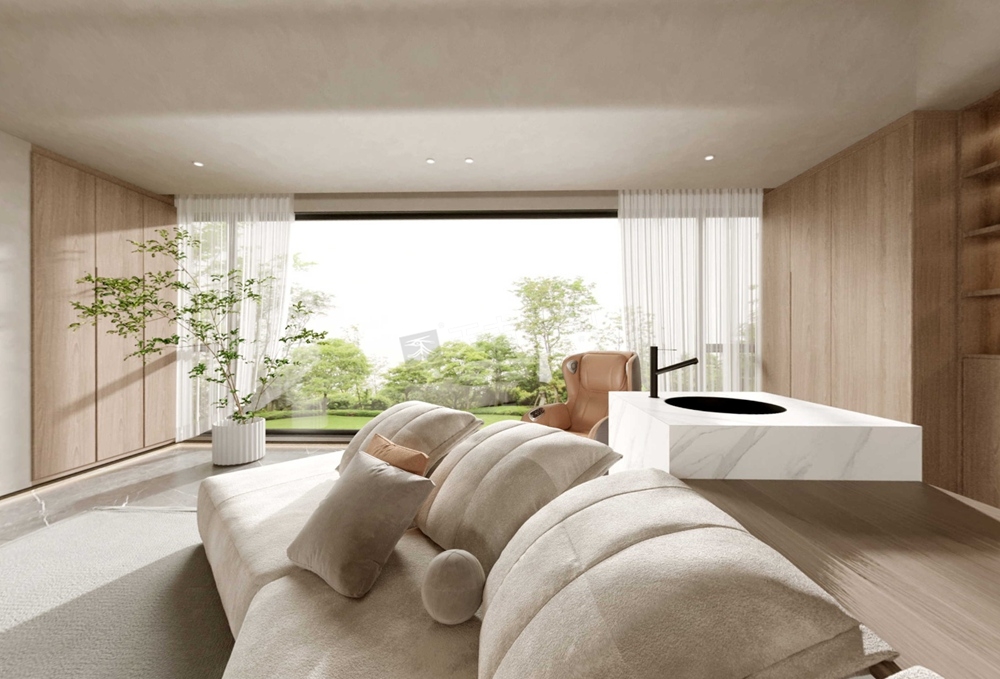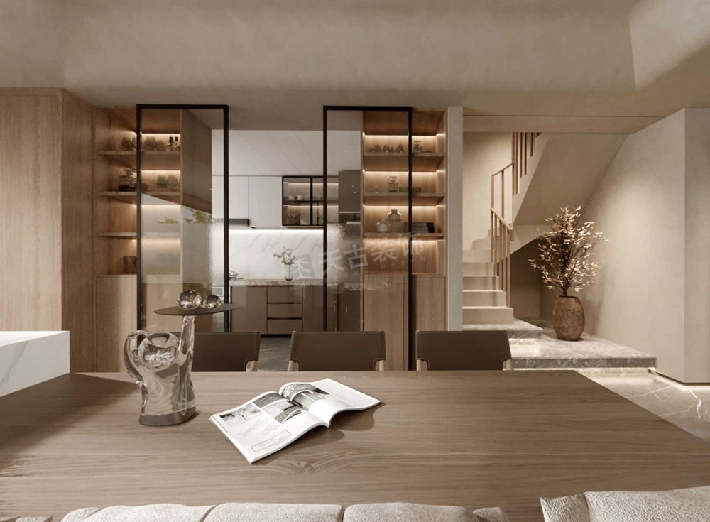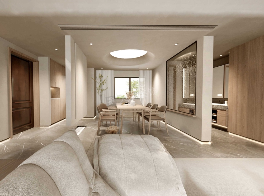 这套曲水风和的别墅装修案例,设计师采用的极简风格设计,不同于其他风格或轻奢,或时尚,或现代的特点,侘寂风的美,是返璞归真,在破旧的物件中,感受岁月本身的美感,条简洁,干净利落;配色淡雅,让人感到舒适,用材自然