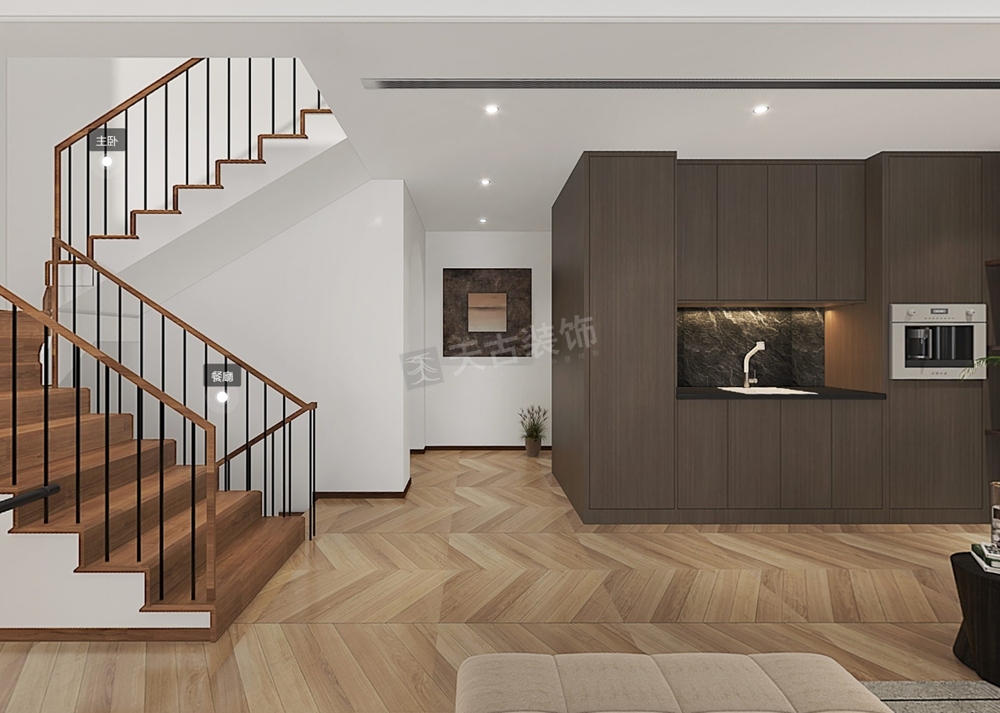 本案是高科江澜叠拼别墅装修设计,现代美式风格。业主是一对常年在外经商的夫妻由于常年在外,未常居住在家希望回到家时是一个能让人安静且能放松下来的居所