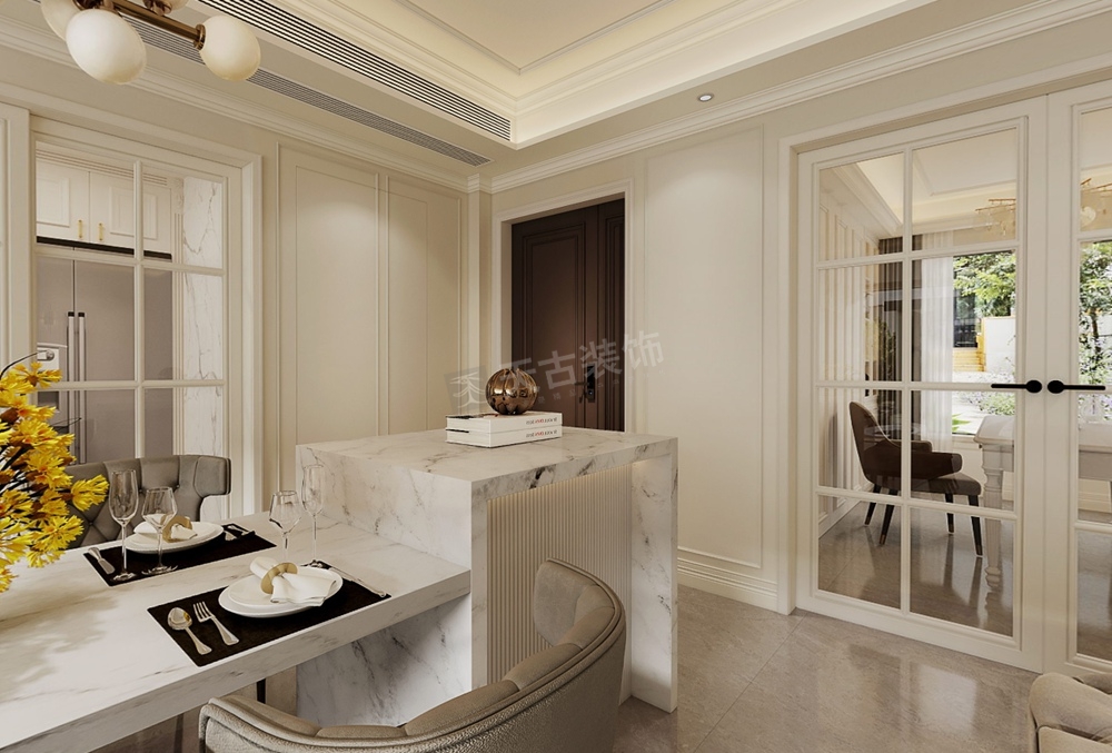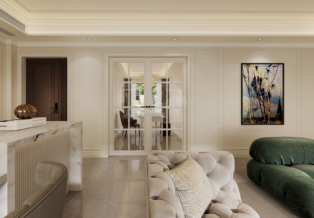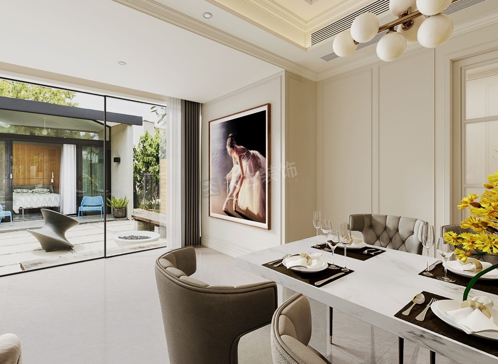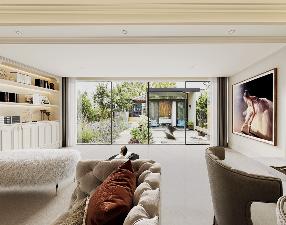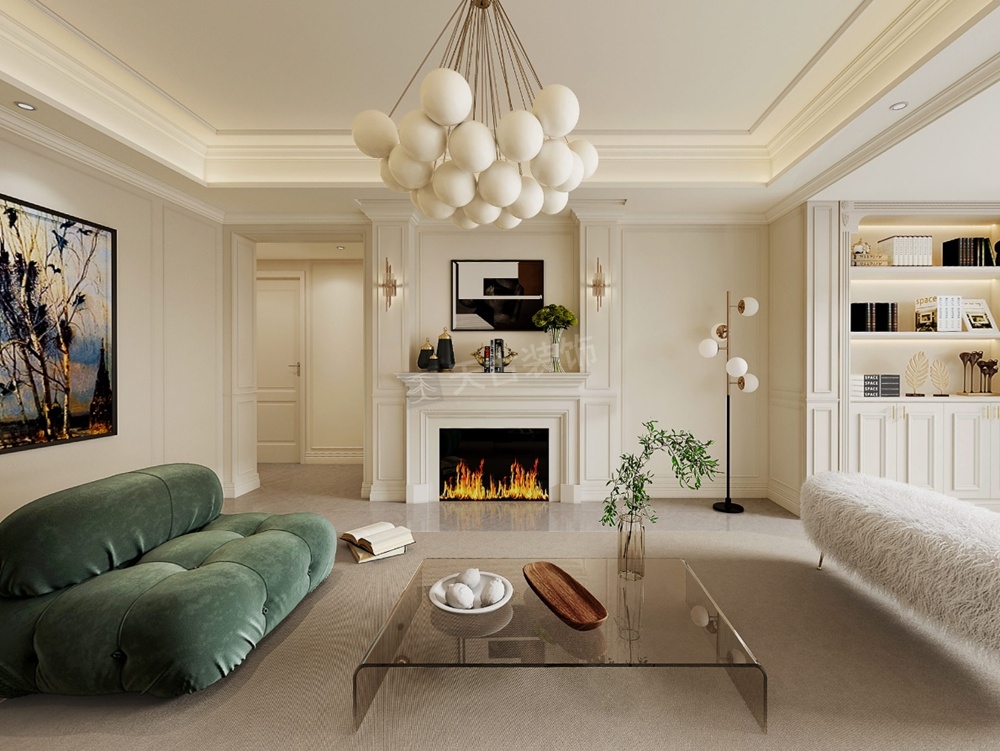 客厅打破传统布局,去电视化设计,沙发不靠墙,让整体更加自由、随性。美式格调的壁炉,摩登的意式极简沙发,精粹简奢,彰显出业主的生活态度。